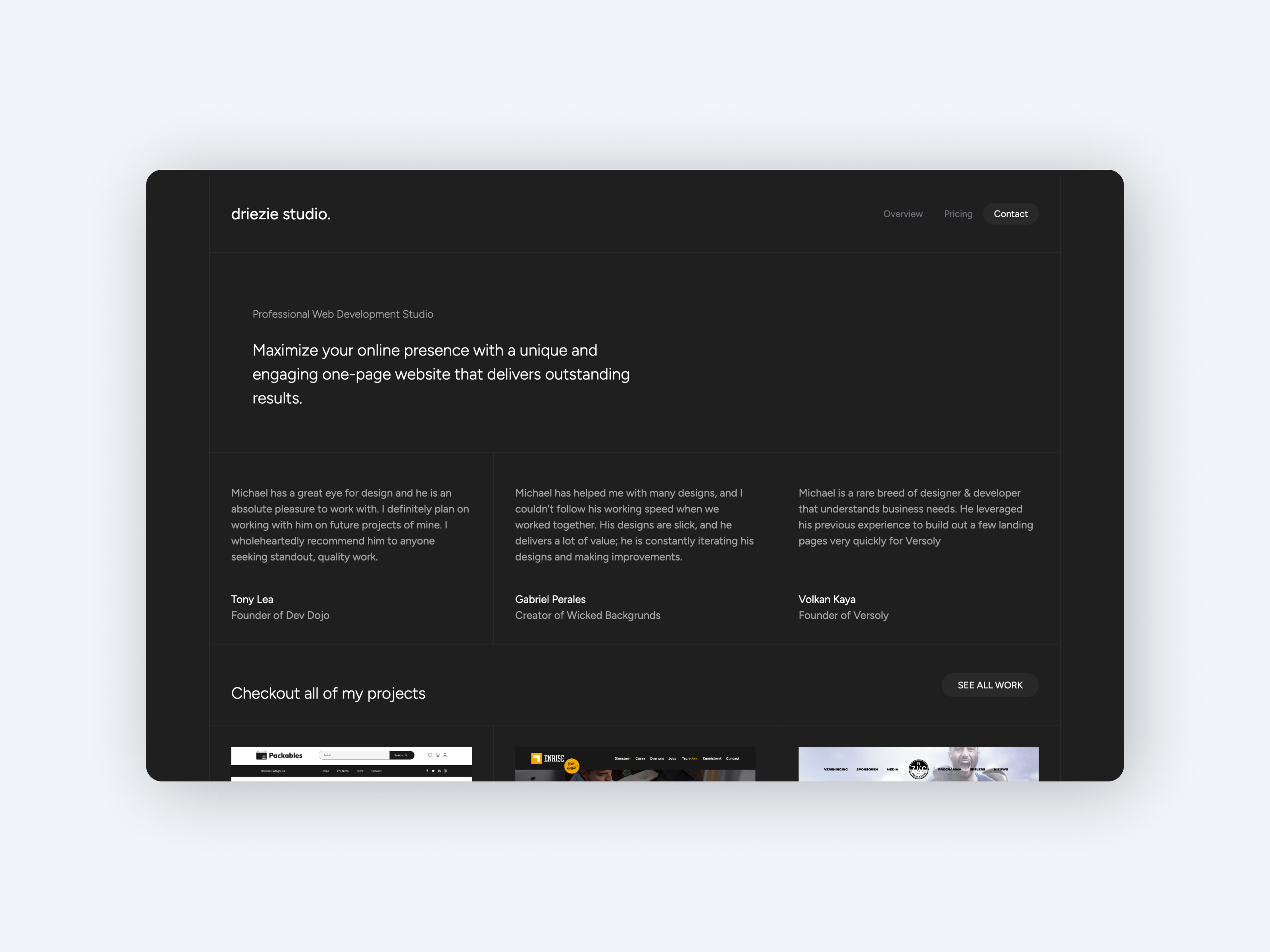 Driezie Studio is a one-person operation, offering personalized attention and direct communication throughout the project. As a student in the Netherlands, I'm passionate about delivering accessible, responsive, and user-friendly websites for brands, agencies, and non-profit organizations.